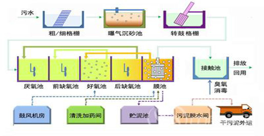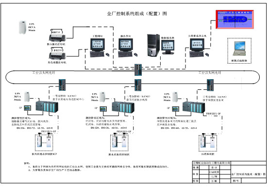 廠區(qū)中控室是整個人機信息交換中心,由2臺互為熱備數(shù)據(jù)服務(wù)器,客戶端操作計算機、DLP投影系統(tǒng)、打印機及UPS等構(gòu)成。主要把過程量信息集中化,把各個現(xiàn)場配置的測控站的數(shù)據(jù)進行收集,并經(jīng)過簡單的操作完成過程顯示,各種圖形的展示,各種趨勢曲線的顯示和控制系統(tǒng)的生成等工作。自動化控制系統(tǒng)設(shè)計遵從“集中管理,分散控制”的理念,由中央監(jiān)控系統(tǒng)(上位機/服務(wù)器)、現(xiàn)場設(shè)備控制站(PLC)網(wǎng)絡(luò)構(gòu)建,各層間具有相對獨立性,并通過千兆光纖工業(yè)以太網(wǎng)進行數(shù)據(jù)交換。 廠區(qū)現(xiàn)場控制站(PLC)直接與各種傳感器,變送器和設(shè)備的電氣回路參數(shù)相聯(lián),負責轄區(qū)內(nèi)設(shè)備的控制、數(shù)據(jù)采集及PLC從站進行通訊,F(xiàn)場的各種檢測儀表將各種水質(zhì)參數(shù)和物理量參數(shù)傳遞給現(xiàn)場控制單元,經(jīng)現(xiàn)場控制單元內(nèi)置程序計算后,控制相應(yīng)設(shè)備動作,同時現(xiàn)場PLC單元將檢測量和控制量通過通訊系統(tǒng)傳給調(diào)度主機,確保出水水質(zhì)指標。對于異常工藝參數(shù),通過網(wǎng)絡(luò)及時向中控室發(fā)出報警信號,并根據(jù)中控室的指令進行應(yīng)急處理。 主要工藝設(shè)備的控制均具有自動、機旁手動、人機界面手動功能,充分考慮維修和維護的方便,讓工藝設(shè)備能平穩(wěn)地從工藝運行中切入和切出?刂瞥绦蚓哂袊栏竦陌踩(lián)鎖,互鎖,確保設(shè)備生產(chǎn)安全運行。 3.工藝流程圖及系統(tǒng)實現(xiàn)功能