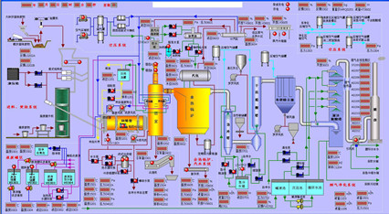 圖1:控制系統(tǒng)網(wǎng)絡(luò)結(jié)構(gòu)圖 危廢焚燒項(xiàng)目的系統(tǒng)控制采用分散式控制系統(tǒng),簡(jiǎn)稱DCS(Distributed Control System)控制系統(tǒng),DCS是一個(gè)由過(guò)程控制級(jí)和操作管理級(jí)組成的以工業(yè)總線通訊網(wǎng)絡(luò)為基礎(chǔ)的計(jì)算機(jī)控制系統(tǒng),它綜合了計(jì)算機(jī)、通訊、顯示、控制4C技術(shù),以分散控制、集中操作、分級(jí)管理、配置靈活、方便組態(tài)為基本思想,它具有高度的可靠性及開放性。該系統(tǒng)代表當(dāng)今工業(yè)控制領(lǐng)域的先進(jìn)水平,廣泛地應(yīng)用于工業(yè)自動(dòng)控制領(lǐng)域之中。 DCS系統(tǒng)控制焚燒線設(shè)備的運(yùn)行,操作員在中控室通過(guò)上位計(jì)算機(jī)進(jìn)行遠(yuǎn)程操作,焚燒處理過(guò)程的工藝參數(shù)由DCS系統(tǒng)監(jiān)視,運(yùn)行數(shù)據(jù)通過(guò)控制計(jì)算機(jī)顯示并記錄,便于操作員觀測(cè)焚燒線的運(yùn)行。DCS系統(tǒng)具有和廠級(jí)計(jì)算機(jī)管理系統(tǒng)通訊的功能,焚燒車間和全廠總控制室可進(jìn)行數(shù)據(jù)交換,焚燒車間設(shè)備運(yùn)行管理數(shù)據(jù)報(bào)表可上傳至全廠總控制室。 控制系統(tǒng)由上位控制計(jì)算機(jī)、系統(tǒng)組態(tài)程序、DCS系統(tǒng)控制器、I/O模件、現(xiàn)場(chǎng)一次儀表、控制閥、分系統(tǒng)PLC(Programmable Logic Controller)、變頻器、二次顯示儀表、現(xiàn)場(chǎng)總線等組成。系統(tǒng)設(shè)上位計(jì)算機(jī)3臺(tái)(數(shù)量可根據(jù)用戶需求增加或減少),其中2臺(tái)系統(tǒng)操作員站、1臺(tái)工程師/操作員站,操作人員在焚燒控制室內(nèi)通過(guò)操作站系統(tǒng)進(jìn)行監(jiān)視和控制操作。操作人員在焚燒控制室內(nèi)通過(guò)鍵盤和鼠標(biāo)對(duì)系統(tǒng)進(jìn)行監(jiān)視和控制操作。除在操作臺(tái)上設(shè)置重要設(shè)備的緊急操作按鈕外,控制室不設(shè)其它常規(guī)儀控表盤。 根據(jù)工藝設(shè)計(jì)要求,焚燒線前部、中部、尾部及輔助車間均設(shè)有工藝測(cè)點(diǎn),現(xiàn)場(chǎng)設(shè)一次儀表進(jìn)行監(jiān)測(cè),主要有熱電阻、熱電偶、壓力變送器、液位傳感器、流量傳感器等。一次儀表將測(cè)量信號(hào)轉(zhuǎn)換為標(biāo)準(zhǔn)電信號(hào)反饋到DCS系統(tǒng)模擬輸入接口,DCS系統(tǒng)對(duì)信號(hào)進(jìn)行模-數(shù)轉(zhuǎn)換處理,參與系統(tǒng)的監(jiān)控。 DCS系統(tǒng)控制總站通過(guò)總線實(shí)現(xiàn)通訊,系統(tǒng)通過(guò)監(jiān)控現(xiàn)場(chǎng)控制各子站(上料系統(tǒng)控制子站、組合燃燒系統(tǒng)控制子站、脫酸系統(tǒng)控制子站、除塵系統(tǒng)控制子站、鍋爐清灰系統(tǒng)控制子站等)實(shí)現(xiàn)對(duì)焚燒線各分系統(tǒng)的遠(yuǎn)程監(jiān)控。任何一個(gè)控制子站在DCS組態(tài)界面上都有獨(dú)立的顯示窗窗口,可方便的調(diào)開其中任何一個(gè)窗口對(duì)其各項(xiàng)工作參數(shù)進(jìn)行設(shè)置和調(diào)整,分析和修正錯(cuò)誤。對(duì)焚燒線主要工況參數(shù)偏離正常運(yùn)行范圍進(jìn)行報(bào)警。 3.工藝流程圖及系統(tǒng)實(shí)現(xiàn)功能