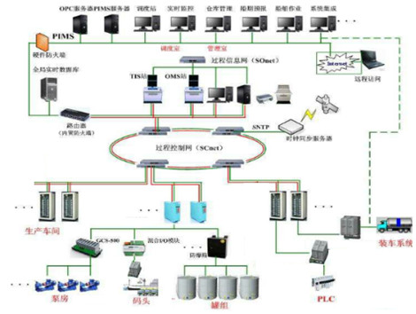 我司提供了基礎油儲運、成品油罐區(qū)高效管理,以及專業(yè)油品發(fā)運,油庫高效管理的整體解決方案。 罐區(qū)網絡結構分為三層: 1.上位監(jiān)控層(管理層) 將使用高性能工業(yè)交換機組建光纖工業(yè)以太網,和計算機監(jiān)控系統(tǒng)中央控制室的數據庫服務器、WEB服務器、操作員站、工程師站等共同構成了系統(tǒng)的管理層。整個監(jiān)控系統(tǒng)采用西門子WINCC軟件對罐區(qū)進行集中管理,實現對整個油庫項目的工藝流程、工藝參數、趨勢、報警、操作記錄等進行操作顯示和記錄,泵根據工藝對閥門、泵等設備進行自動控制。 HYE潤滑油管理軟件可以將各罐區(qū)溫度、液位等參數進行采集,統(tǒng)計,并根據罐容表和GB/1885-19981進行罐容計算,標準密度計算、20℃和15℃標密轉換、自動發(fā)油計算、質量計算、油品體積計算等。 中心監(jiān)控軟件可以把現場的作業(yè)流程進行調度和管理,全面提高罐區(qū)的運作效率和產品流轉速度。 2.中心設備層 使用西門子高效PLC技術為核心,完成油庫現場數據的采集。該系統(tǒng)通過光纖工業(yè)以太網與中央控制室的上層監(jiān)控系統(tǒng)相連接,融合為一個有機的整體,實現對罐區(qū)的集中管理,分散控制。 3.現場控制層 由遠程控制站、球掃站、現場通信接口、智能儀表等構成系統(tǒng)現場層,采用西門子Profibus,Profinet等先進的工業(yè)網絡與中心設備層進行無縫連接。 3.工藝流程圖及系統(tǒng)實現功能